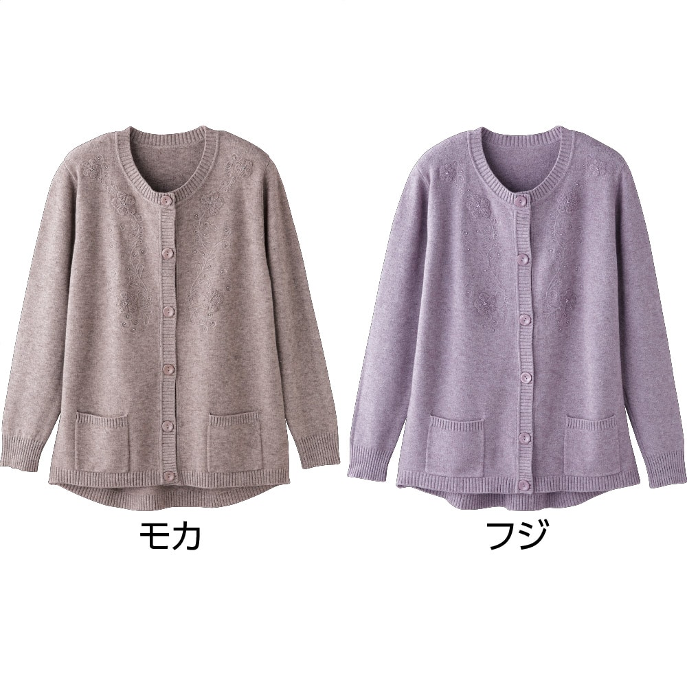 両肩から胸にかけて施した刺繍はカーディガンと同色なので目立ちすぎず、さり気ないおしゃれを演出します。
