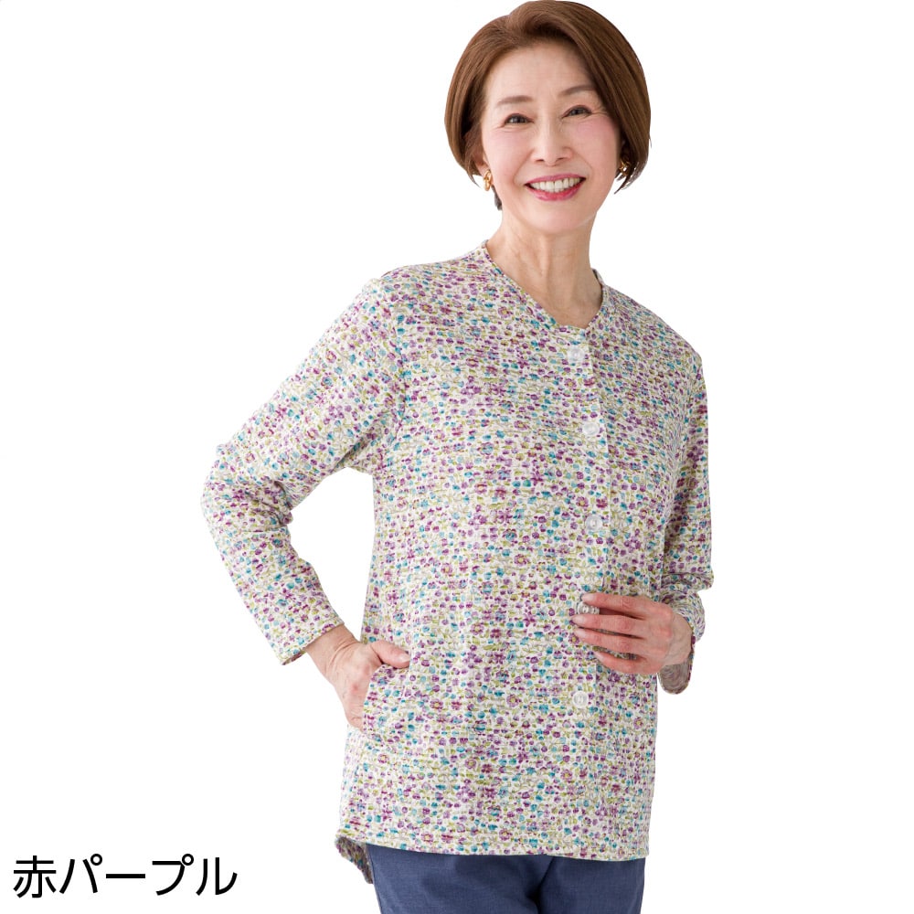 やさしい印象を演出する小花柄。【指先ストレッチ】とめにくい第1・第2ボタンがマグネットでその下は普通のボタンになっております。【身幅ゆったり】体を通しやすいゆったりとした身幅で、脱ぎ着がラクラク!【ゆったりアームホール】肩に負担をかけず、腕が通しやすい大きめアームホールです。【後ろ身頃長め】背中や腰の曲がってきた方にもぴったりフィット!【名前記入欄付き】まとめて洗濯しても間違いません。