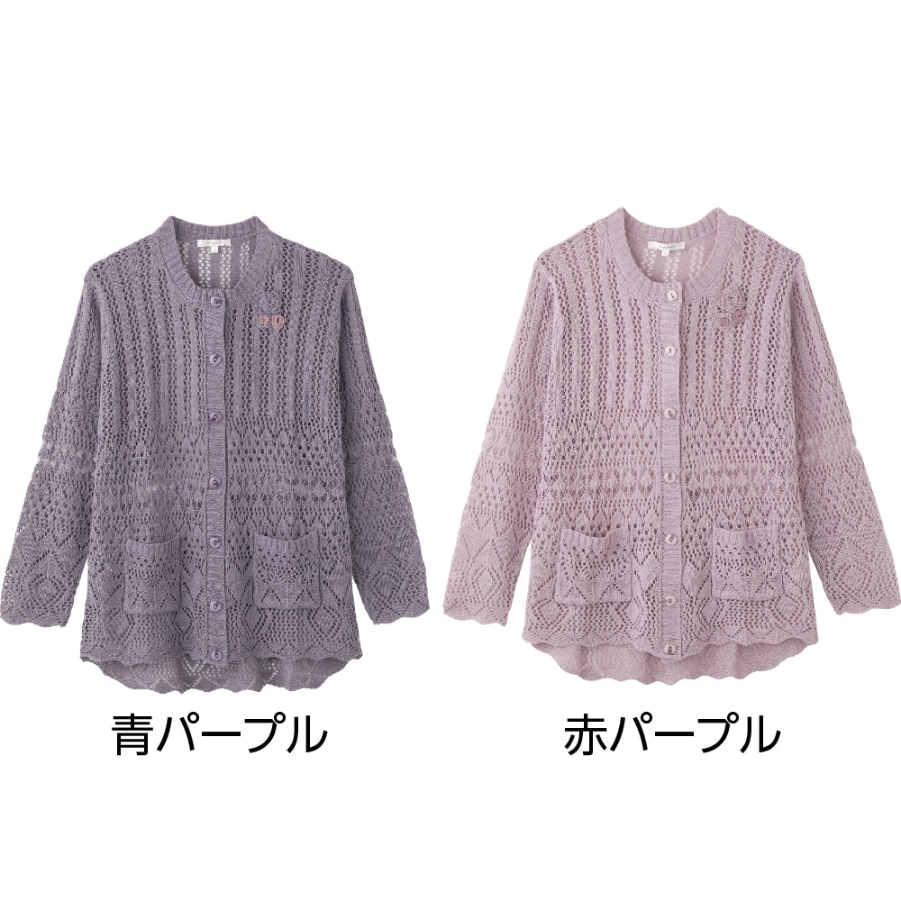 変化に富んだ編地にモチーフがアクセント。【ワンタッチテープ】見た目は普通のボタンですが、裏がワンタッチテープで、開け閉めが簡単です。【身幅ゆったり】体を通しやすいゆったりとした身幅で、脱ぎ着がラクラク!【後ろ身頃長め】背中や腰の曲がってきた方にもぴったりフィット!【名前記入欄付き】まとめて洗濯しても間違いません。