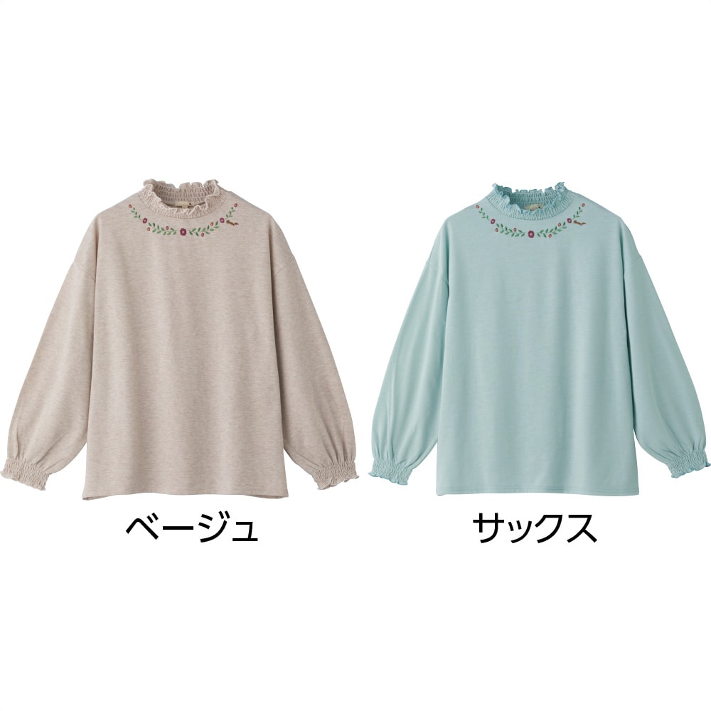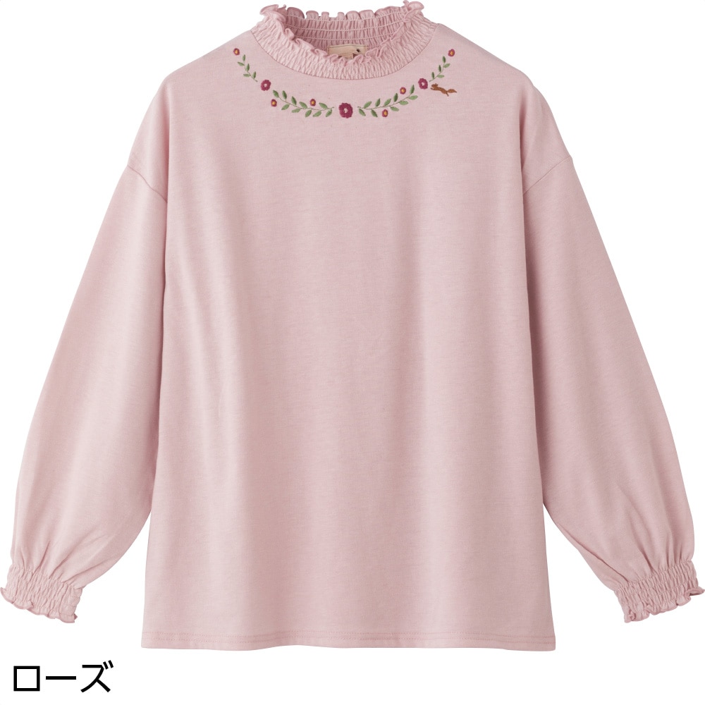 衿元と袖がシャーリングで伸びるので着脱スムーズ。花柄刺しゅうがアクセント。