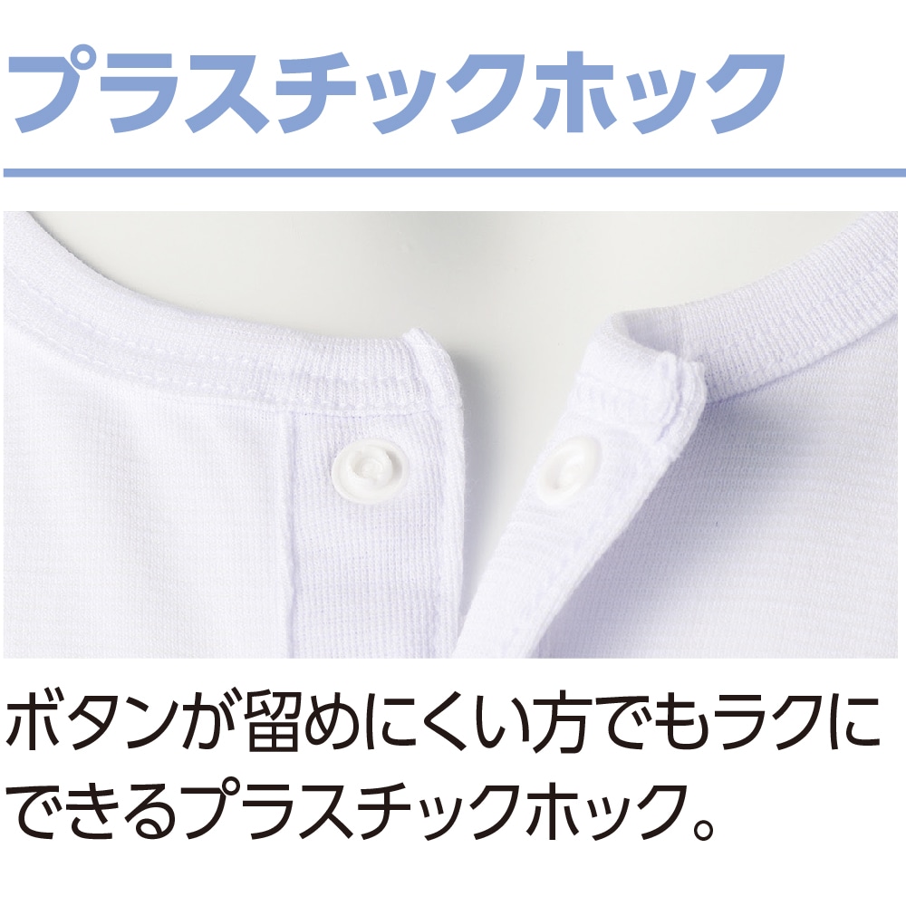 【プラスチックホック】ボタンが留めにくい方でもラクにできるプラスチックホックです。【後ろ身頃長め】後ろ身頃が長めになっていて前かがみでも背中が出にくいです。動きやすいラグラン袖です。
