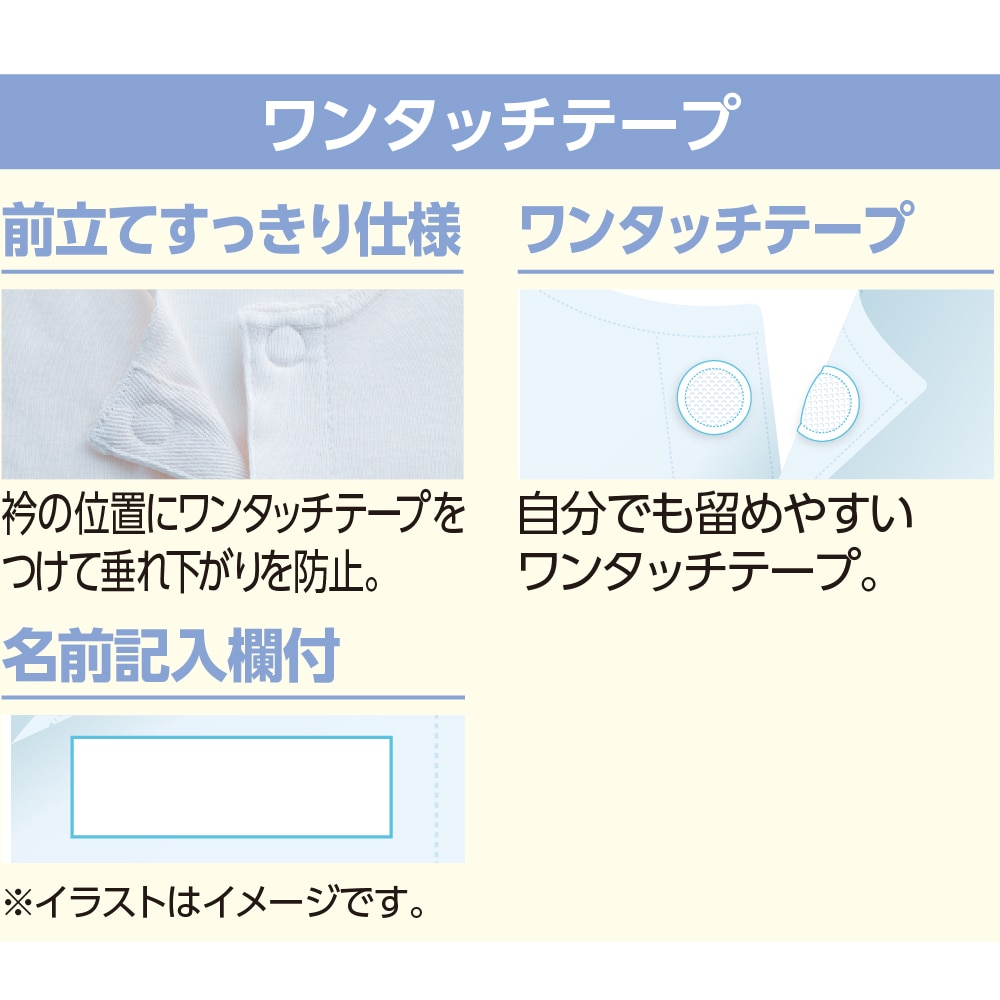 ◆ ボタンが苦手な方におすすめ ◆ボタンが苦手な方におすすめのワンタッチテープ式。※接着力維持のため、洗濯の際はワンタッチテープを留めて洗ってください。肌にやさしい綿100%素材を使用。【前立てすっきり仕様】●衿の位置で止めているので垂れ下がらない。●裏面を布で補強して伸びを防ぎます。●肌面が平らで痛くなりにくい。抗菌防臭、消臭機能付きです。