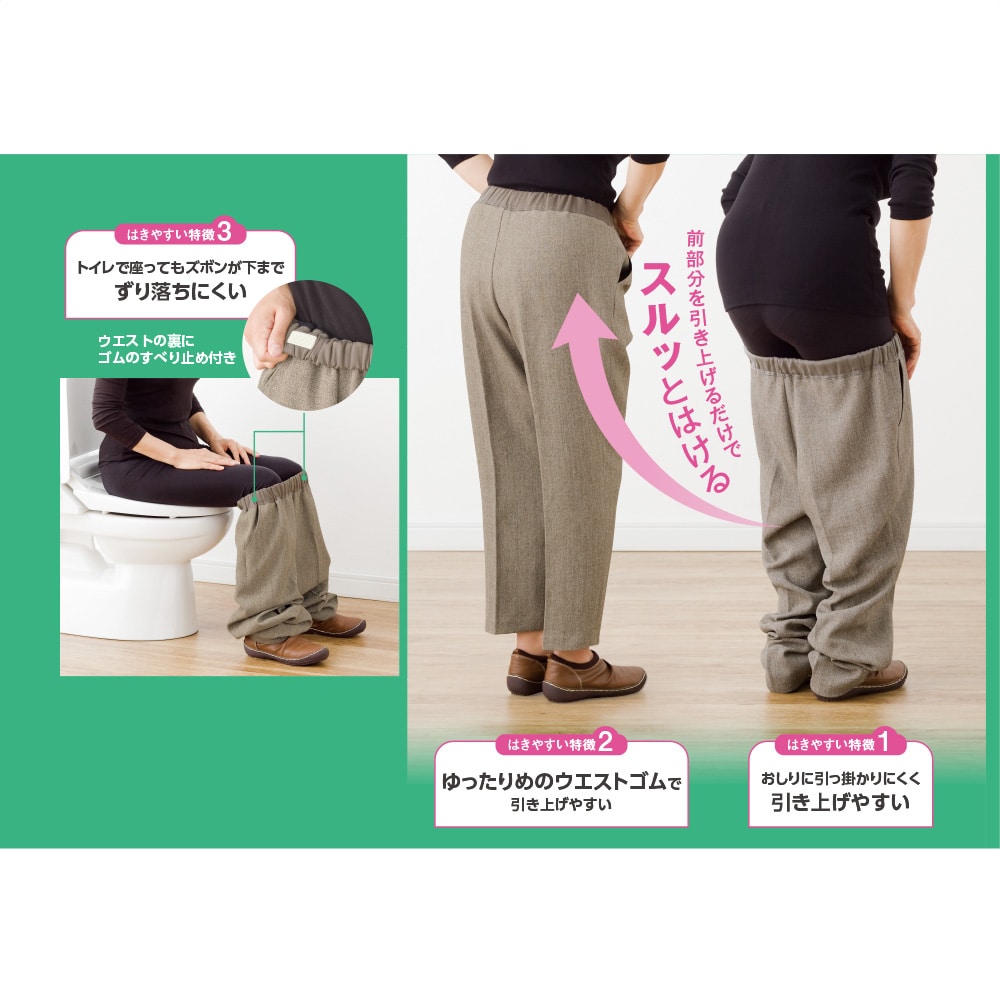 ウエストゴムを大きめに設定しているので手の力が弱くても引き上げやすい。