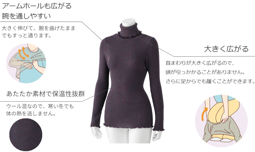 袖口・袖まわり・首まわりが伸びることにより、着替えやすい仕様に。